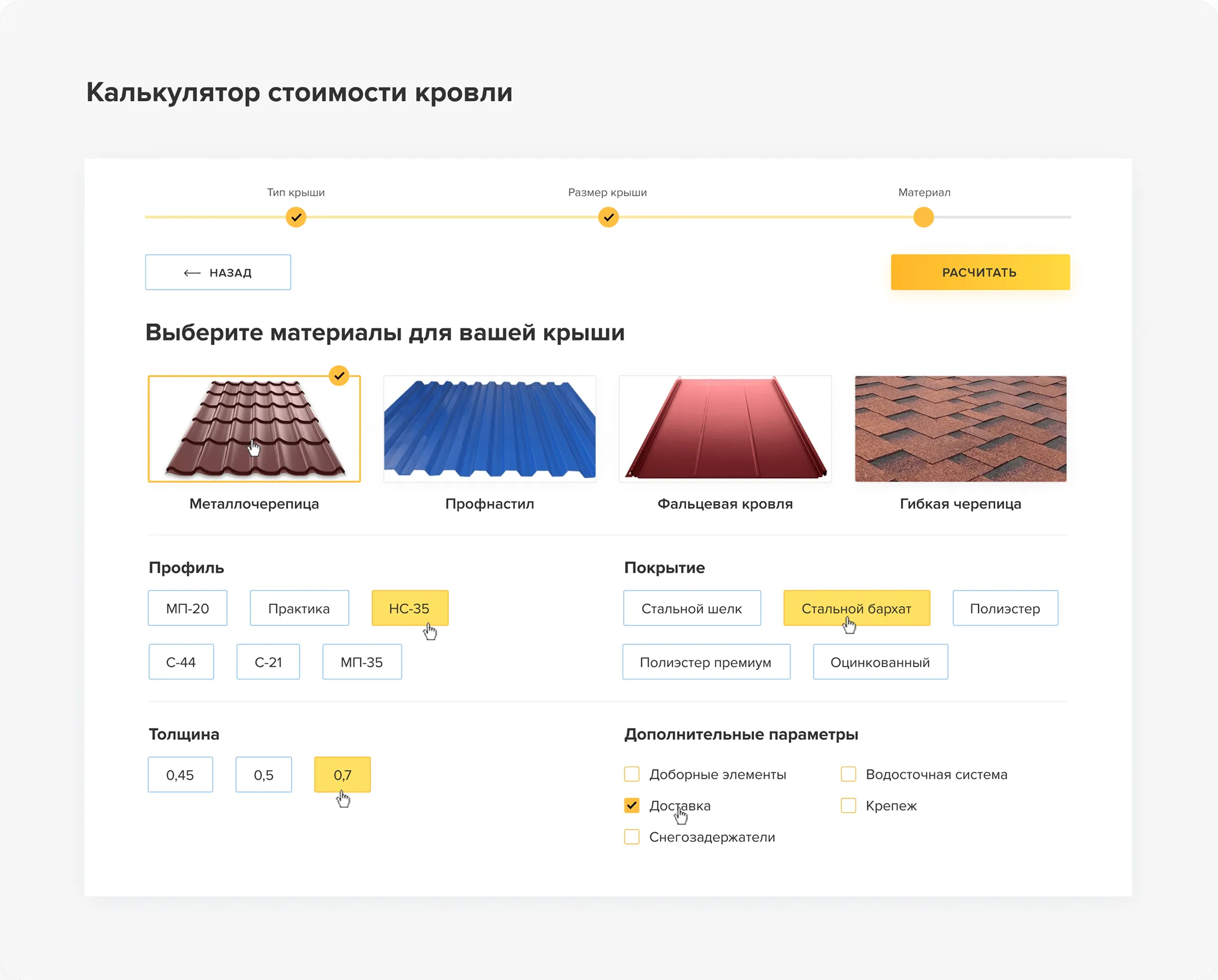 На этапе выбора материала мы сразу предложили добавить в расчет доборные элементы и доставку. Это увеличило точность сметы для клиента
