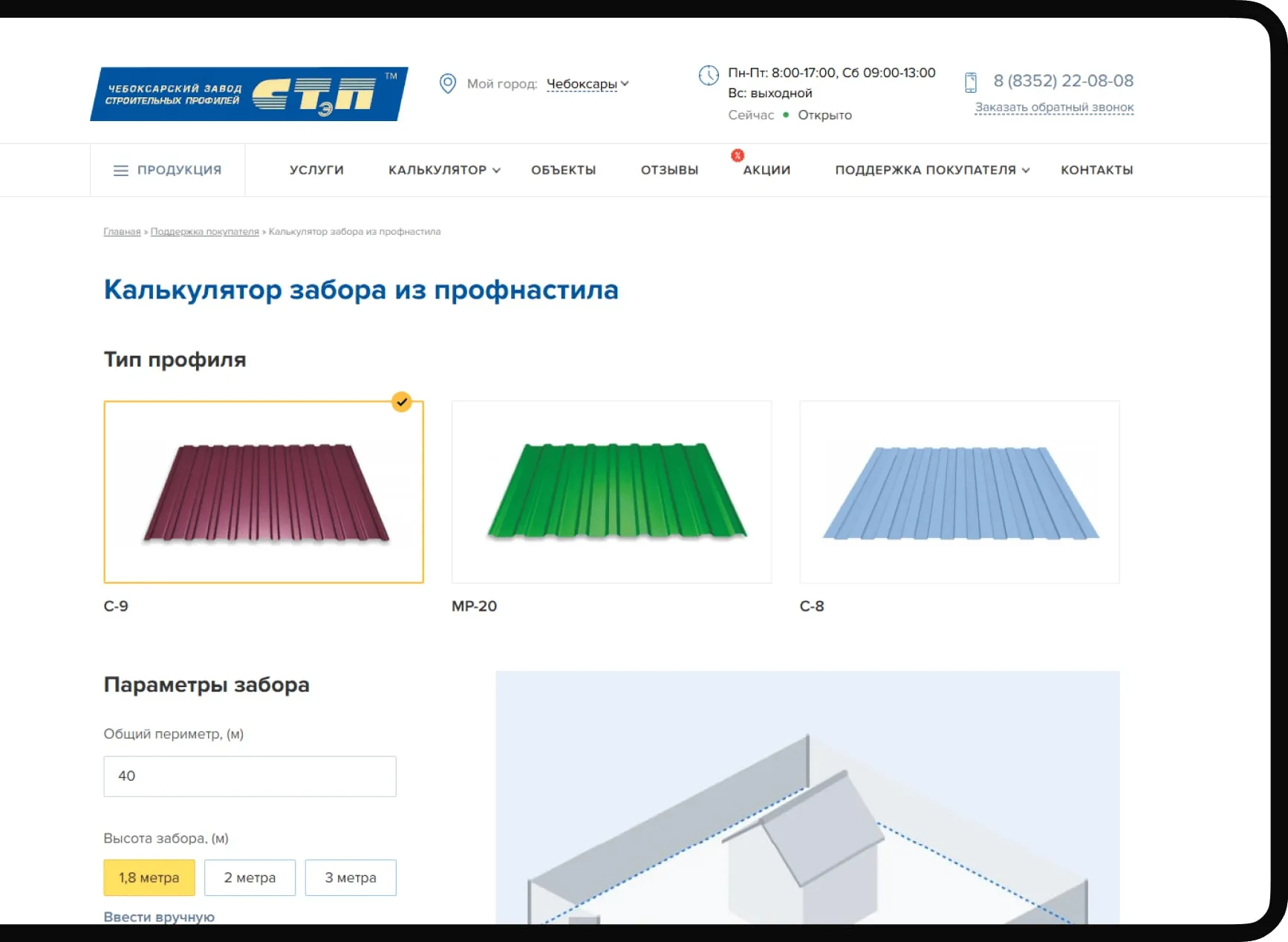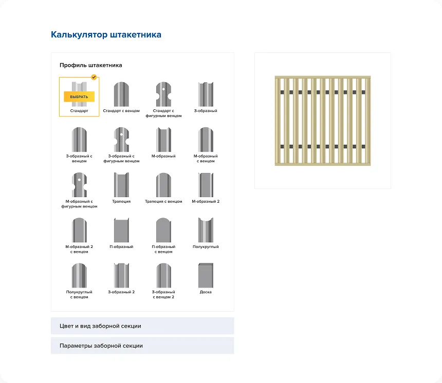 Здесь мы реализовали визуальный конструктор с полной кастомизацией. Пользователь в режиме реального времени видит, как меняется его будущий забор.