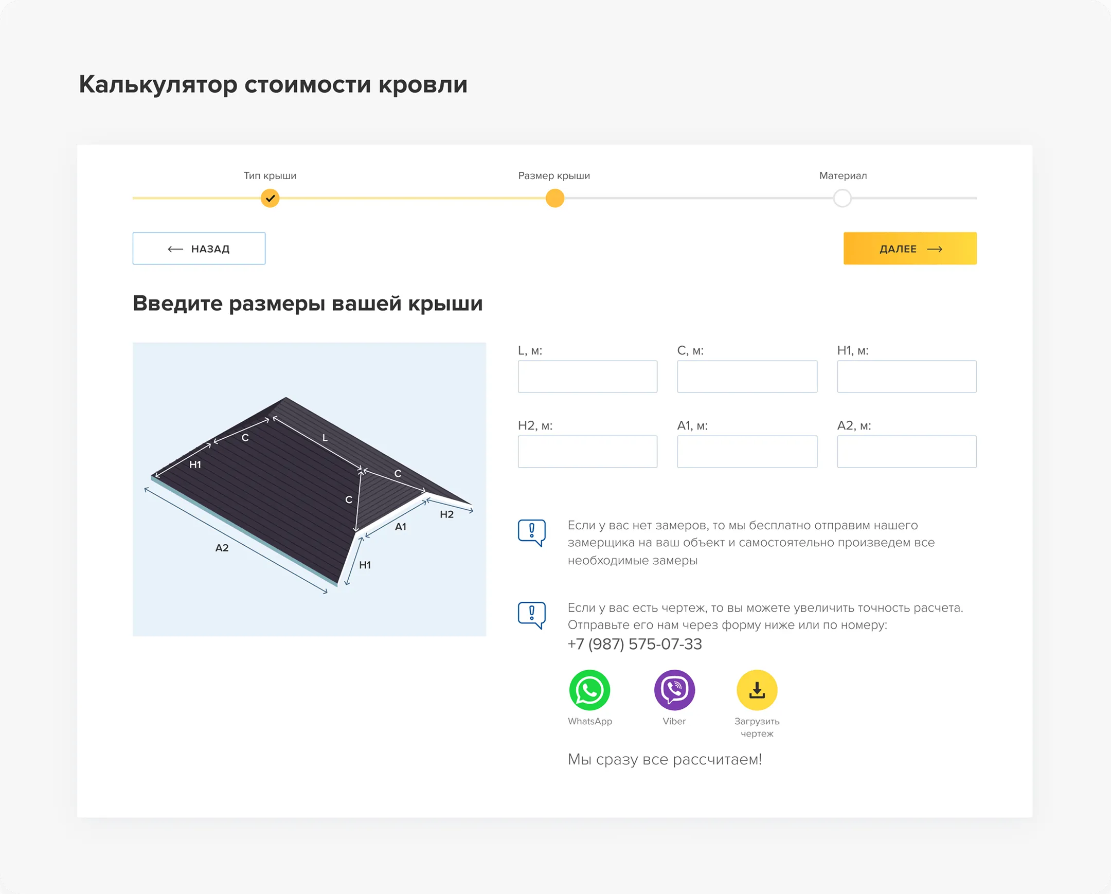 В итоге у нас получился удобный калькулятор с понятным интерфейсом, в котором есть возможность автоматически сделать расчет. А ещё связаться с менеджерами завода, если нужно вызвать замерщика или посчитать стоимость по готовому чертежу.