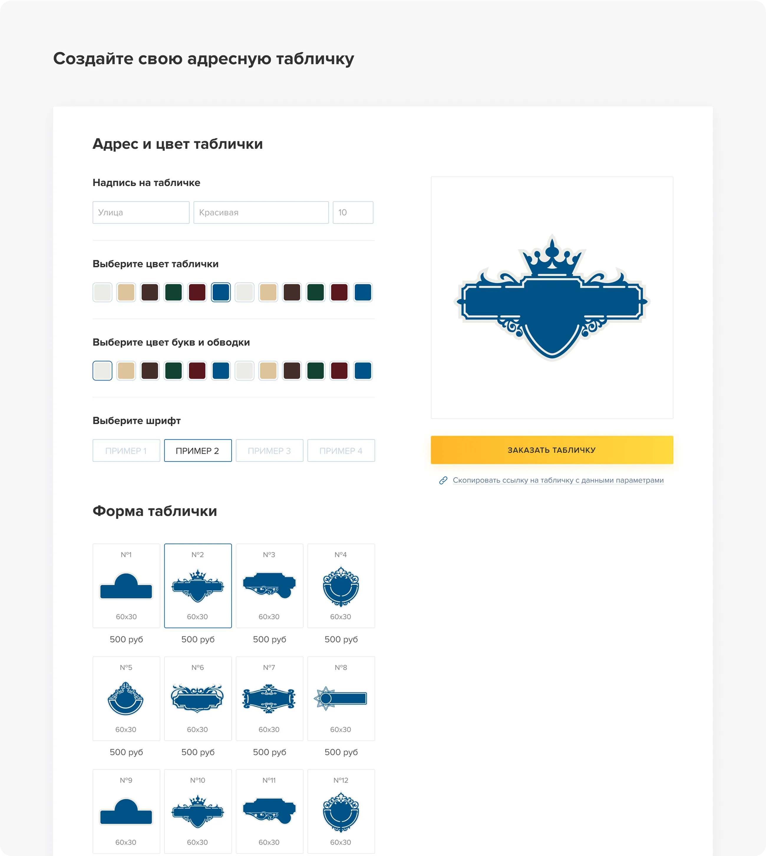 Вместе со специалистами из СТэП мы создали конструктор, в котором за пять минут можно сделать табличку с адресом дома. Нужно ввести адрес, выбрать цвет и форму таблички. На экране появится макет.